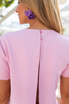 - Pink jumpsuit that features an open back detail paired with two buttons on the back to fasten. This jumpsuit offers a zipper on the 'pants' and a flowy-comfortable fit. This is the perfect jumpsuit to style up or down!