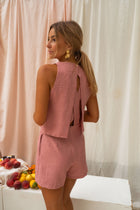 - It doesn't get easier than our Jade romper! Experience effortless elegance this summer in our sleeveless pink romper, featuring an open back with crossing straps and a zipper at the back of the waist for functionality. This romper is lined for comfort and confidence and is not sheer.