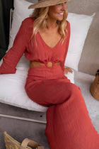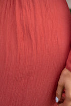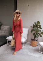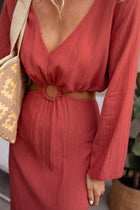 - Brick colored, long sleeve, midi length dress with open/cut-outs on the sides paired with ring-hole detail in the middle near the chest. Has a v-neckline, flowy form and has an elastic band in the back for stretch and comfort. The ultimate dress for your summer holiday vacations, pool parties, or even days out in the city!