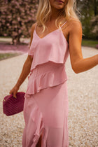 Graceful and effortlessly elegant, the Dusty Pink Romane Dress moves with you. This long dress features delicate ruffles that create soft movement, a flattering V-neckline, and adjustable straps for a perfect fit. Lined to mid-thigh for comfort and ease, it adds a subtle, refined charm to any look.