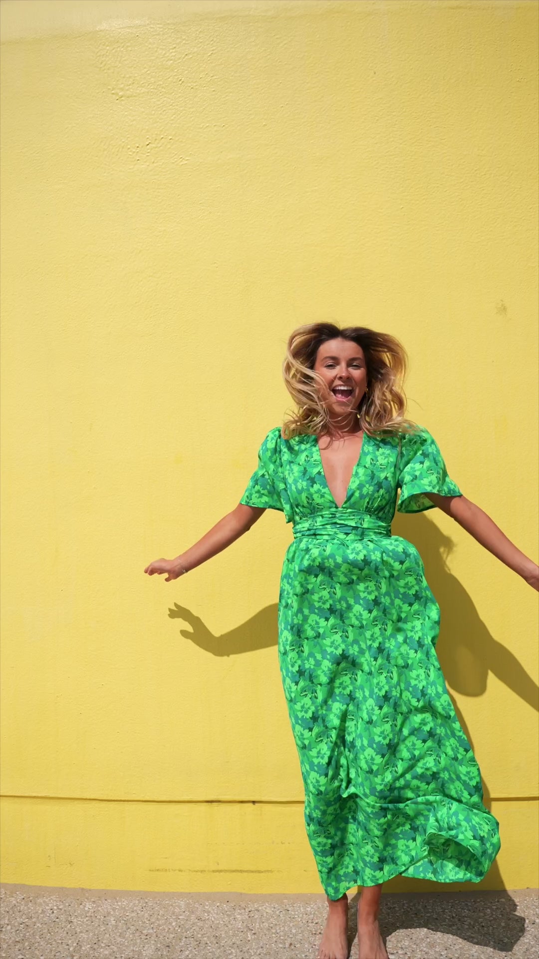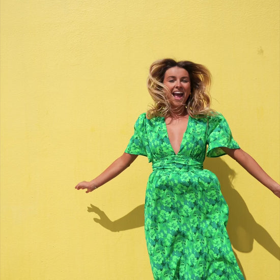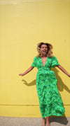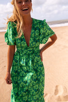 - Green patterned, slightly flared short sleeve maxi dress with a deep v-neckline with an open back detail. The perfect dress for any occasion this summer - dress up or down!