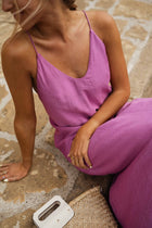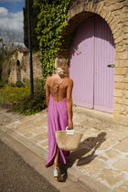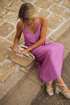 Long and flowing, the Mauve Clemence Dress is designed to turn heads. A soft V-neck leads to an open back, finished with delicate pearl details for a refined touch. The fluid fabric moves beautifully, while the full lining ensures coverage without sacrificing comfort. A subtle back slit completes the look, adding elegance to every step.