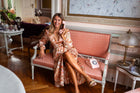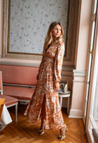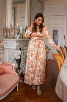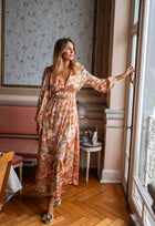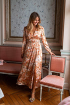 - Orange and khaki patterned maxi dress that features golden patterns, long sleeves, a slit on the side, and a deep v-neckline. This dress offers lining, a flowy fit-structure and elastic on the wrists. The perfect dress that offers versatility no matter the occasion.