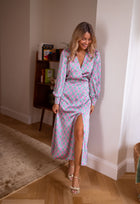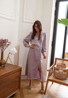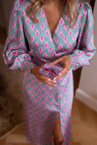 - Long sleeved, colorful patterned maxi dress with a wrap front, snap button on neckline and split at the bottom. Has a flowy, comfortable yet flattering fit and is perfect for the Spring and Summer seasons!