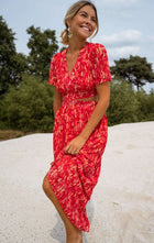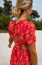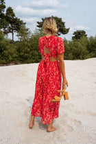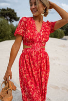 - Red patterned maxi dress with beautiful short flared sleeves paired with a lush v-neckline in addition to feminine cut out detailing on the sides going to the back with an adjustable bow to tie. This dress has lining and is flowy and airy which is perfect for the summertime, in addition to having elastic band on the back for stretch and comfort.