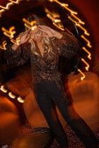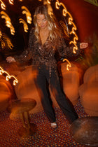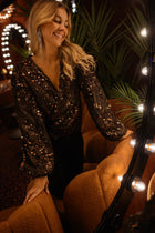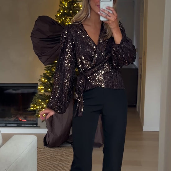 Shine subtly in the Brown Anabel Blouse. Its wrap design flatters the silhouette, while the brown glitter adds a refined shimmer. Featuring long sleeves with a gentle balloon shape, this blouse is perfect for elevating both casual and evening looks, paired effortlessly with skirts, trousers, or layered ensembles.