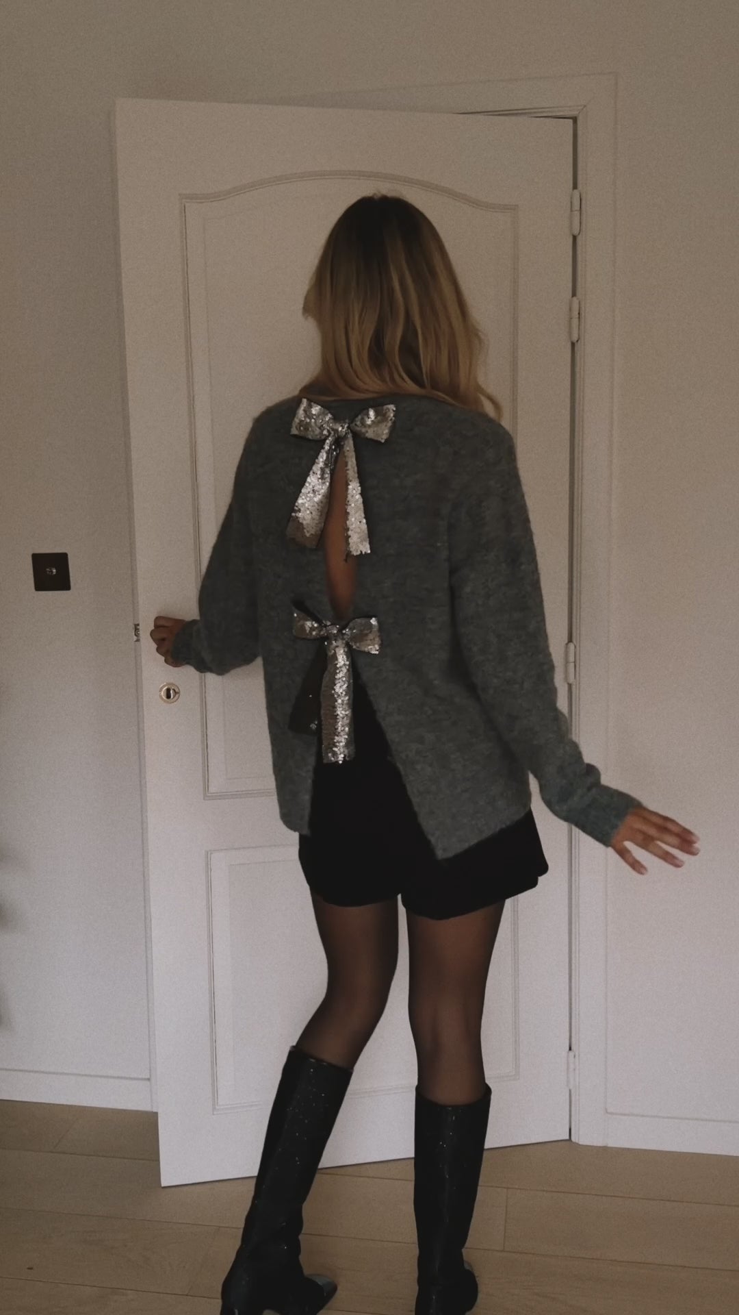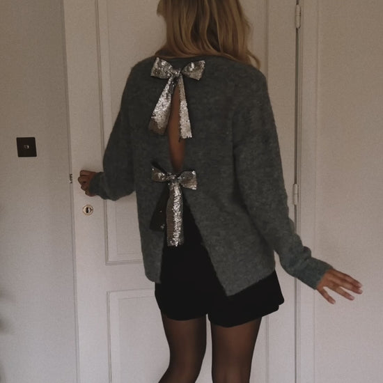 Add a touch of charm to your knitwear with the Grey Numa Sweater. Designed with shiny silver bows along the back and a subtly open detail, it brings a playful twist to a classic silhouette. The crew neck and long sleeves keep it cozy and easy to style, making it a perfect pick for both casual and dressed-up looks.