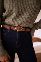 - Camel adjustable belt that features a braided-effect as well as a golden buckle. This belt is not just chic and versatile but also functional.