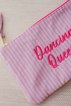 Mauve and pink pouch with “Dancing Queen” embroidery, lined background, and pull tab. A fun and functional everyday accessory.