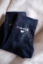 - Cozy yet chic, shiny blue socks that feature an 'Amour' logo followed by a little heart detail. These socks are the perfect accessory/wardrobe addition to elevate any outfit. Trendy