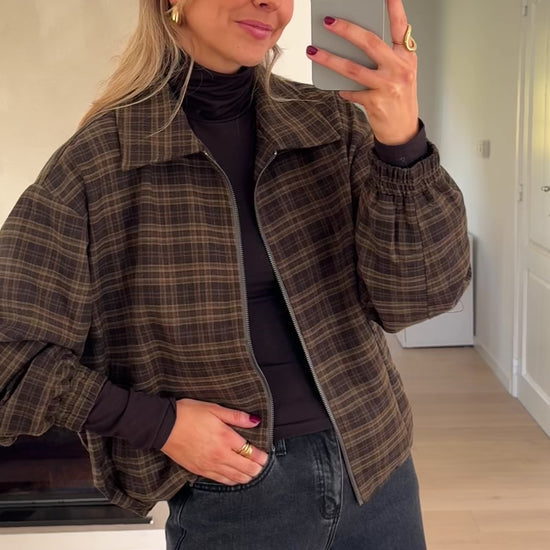 Add a statement layer to your look with the Khaki Checkered Philipa Jacket. Featuring checkered patterns, long sleeves with a slightly loose fit, and practical side pockets, this jacket blends comfort with style. Finished with a silver pull tab, it’s perfect for everyday wear and easy layering across seasons.