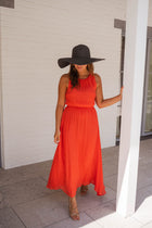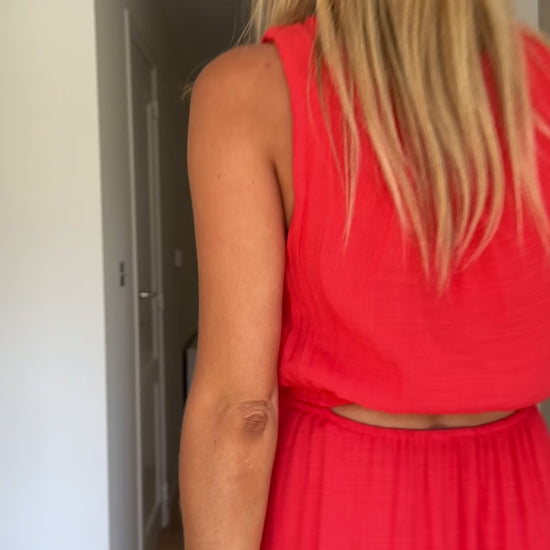 Brighten up your look with the Coral Ana Dress, designed in a soft, flowy fabric that moves effortlessly with you. It features a round neckline, sleeveless cut, and a subtly open back for a breezy feel. The elastic waist adds comfort, while the full lining ensures smooth, easy wear—perfect for sunny days or casual evenings out.