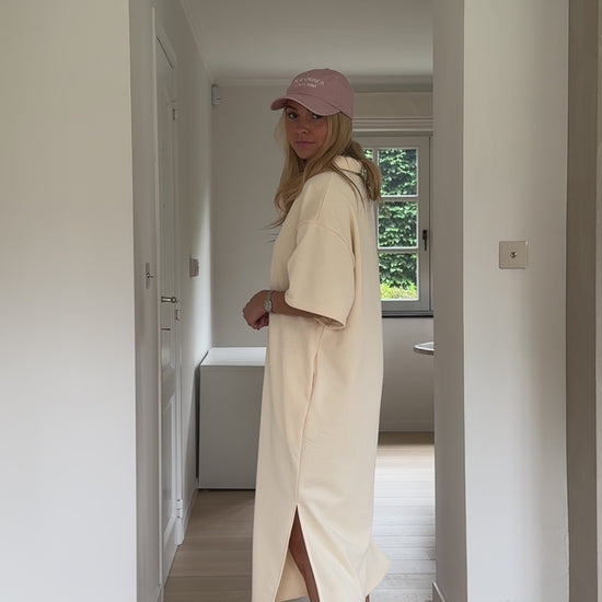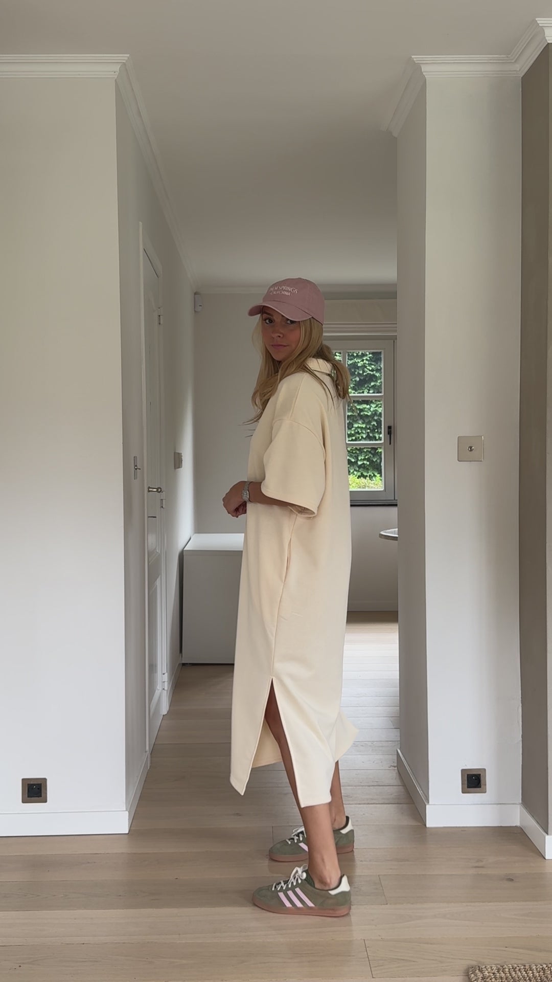 Effortlessly stylish, the Pale Yellow Carmela Dress is your go-to for easy elegance. Designed with a lapel collar, soft sweater-effect fabric, and a relaxed long silhouette, it features short sleeves, side pockets, and a subtle slit at the hem—combining comfort with everyday charm.