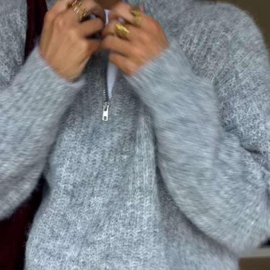 Make the Grey Nicolas Sweater your go-to layering piece. The striking high collar and refined silver zipper pull deliver modern sophistication, while the incredibly soft, warming fabric keeps you comfortable all day. Its relaxed fit offers the freedom you need without sacrificing style—a timeless addition to any closet.