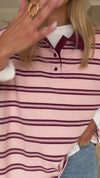 Refresh your wardrobe with the Pink and Burgundy Amilia Polo Shirt, where classic design meets modern ease. Its burgundy notched collar with button accents and long sleeves add a tailored touch, while the loose, flowing fit keeps it effortlessly comfortable. Perfect for casual outings or smart layering, this polo shirt brings color and elegance to everyday styling.