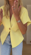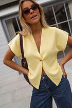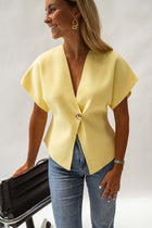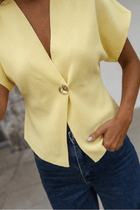 Chic and feminine, the Yellow Laurine Blouse is perfect for creating a polished, dressy look. Its slightly flared cut offers a flattering silhouette, while the V-neckline is highlighted by a refined gold button for an elegant touch. Designed with short sleeves and a lightweight, unlined finish, this blouse feels airy and comfortable while maintaining a sophisticated style ideal for both day and evening outfits.