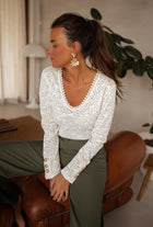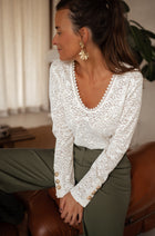 - Ecru lace, long sleeve blouse that has beautiful golden hardware/button detailing on the sleeves, as well as a v-neckline that has lush embroidery detailing. The perfect blouse to dress up or down for the Fall and Winter seasons.
