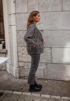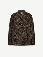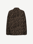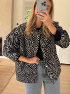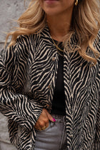 - This stylish bomber jacket features a bold zebra pattern, long sleeves, and a slightly loose fit. The silvery snap buttons add a touch of glamour while the elastic waist adds definition to your silhouette. Complete with two front pockets, this jacket is both functional and fashionable.