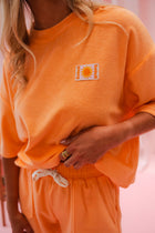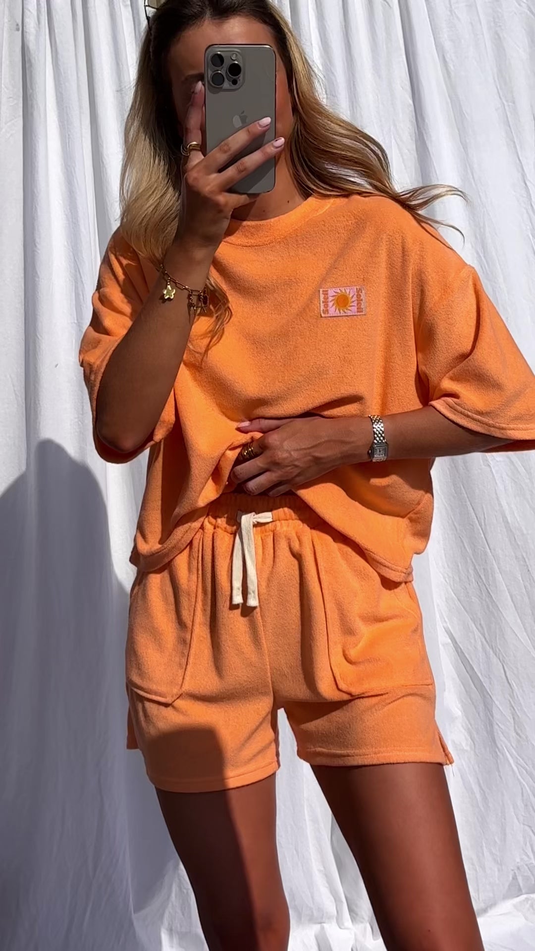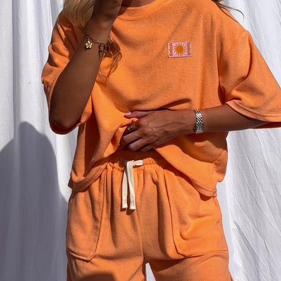 The Orange Soly T-Shirt is crafted from cozy terry cotton and features a round neckline and a bold ‘SOLEIL’ label on the front. A cheerful staple for sunny days.