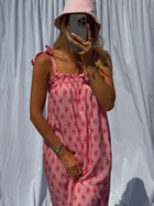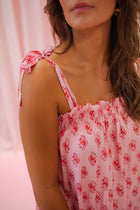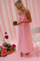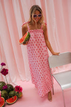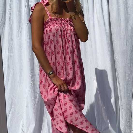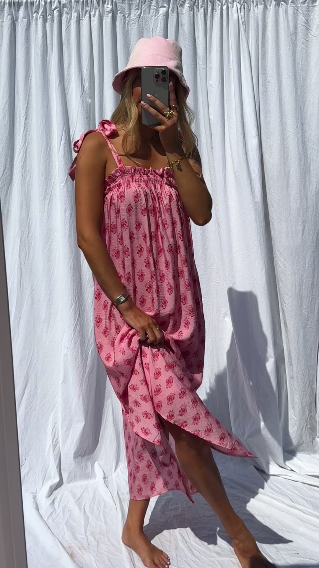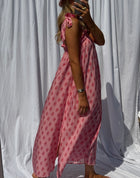Effortlessly feminine, the Pink Mahila Dress features adjustable tie straps, a fluid loose fit, and a chic bottom slit. Finished with a square neckline and smocked detail, it's your go-to for easy summer elegance.