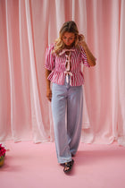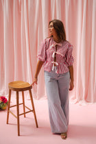 The Red Striped Gillie Blouse features soft half-length sleeves, a classic round neckline, and playful pink ties that add a fresh, feminine touch. An easy statement piece for any casual look.