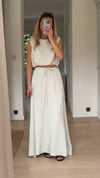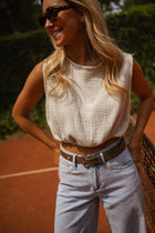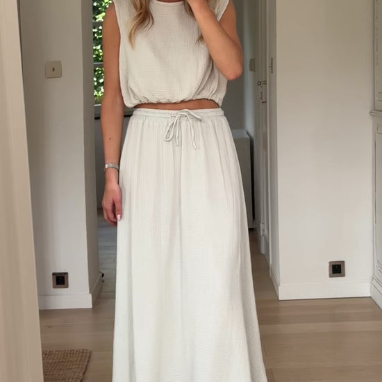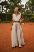 Breezy and versatile, the Beige Salma Top is made in Italy from soft cotton gauze. This sleeveless design features a round neckline and an adjustable tie at the hem for a custom fit. Its lightweight, non-transparent fabric makes it a go-to for warm days and effortless layering.