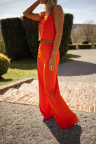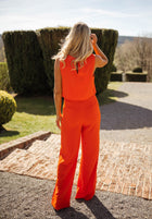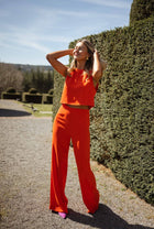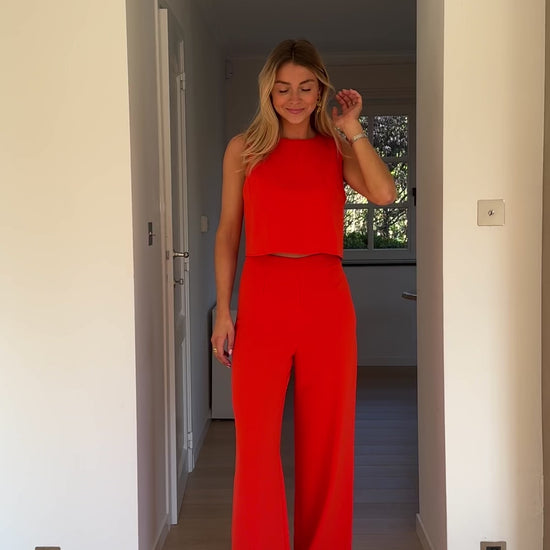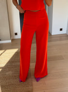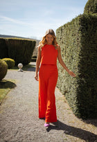 - The Coral Soline Pants sit high on the waist and close with a discreet zipper at the back. With a flattering, slightly tight fit through the hips and a flared cut at the legs, they offer both structure and movement in a vibrant coral hue.
