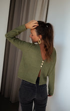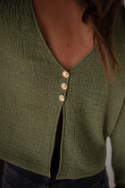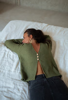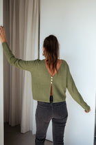 - Khaki long sleeve sweater that can be worn both ways (front to back), as well as having three golden hardware-button detailing followed with a little opening/slit below the buttons. This sweater is super soft, cozy, and versatile!