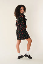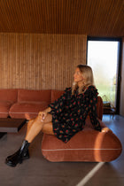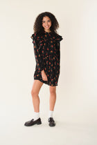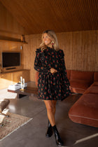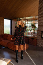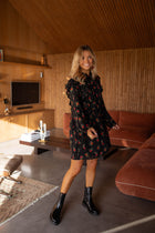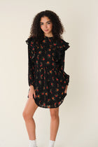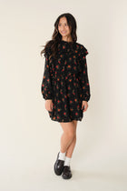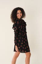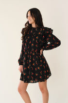 - The Black Floral Elane Dress combines elegance and charm with its long sleeves, slightly mock neck, and ruffled details on the chest. Elastic at the wrists ensures a comfortable fit, while the lined design and button closure at the back add a refined touch. The perfect dress for both casual and dressy occasions, offering a flattering and feminine silhouette.