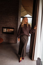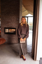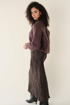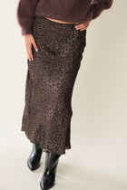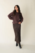 - Indulge in the luxurious Long Skirt featuring a fierce black leopard pattern against a rich chocolate background. The elastic waistband and delicate lace detailing add a touch of elegance, while the flowy fabric flows gracefully with your every movement. Embrace your wild side while staying comfortable and stylish in this unlined piece.
