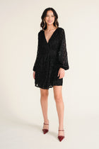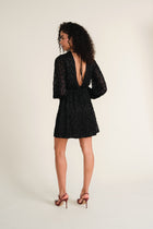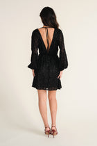 • Make a statement with the Black Henno Dress. Its shiny fabric and v-neckline create a sleek, sophisticated look, while the v-shaped open back and bow tie add a touch of chic. Featuring long sleeves, an elastic waist, and a lined design, this dress combines style and comfort for any occasion.