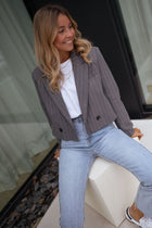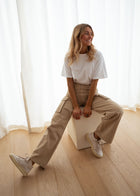 - Our model wears the Light Blue Hunter Jeans, Grey Striped Linnel Pants, Ecru and Beige Amanda Tweed Jacket and Beige Laurel Cargo Pants