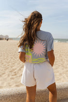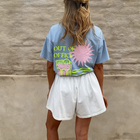 • The Blue Office T-Shirt delivers casual comfort with a pop of personality. Designed with classic short sleeves and a crewneck, it stands out with a neon yellow and pink logo at the back—adding a bold, unexpected twist to a timeless basic
