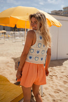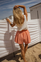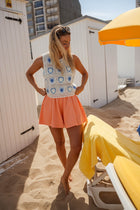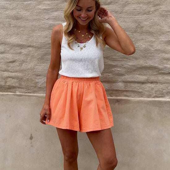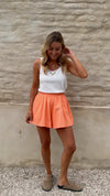 - The Orange Erica Shorts are made for easy, everyday comfort. Designed with a flattering high-rise fit and an elastic waistband, they offer effortless wear and a touch of bold color. Roomy front pockets and a relaxed cut make them a go-to for warm, carefree days.