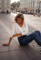 - Ecru long sleeve sweater that has a beautiful v-neckline and is super soft and cozy. This sweater is the perfect 'not-so-basic-basic' to have as a part of your wardrobe collection to dress up or down all year round.
