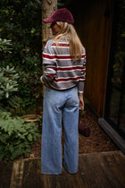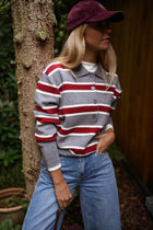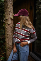 The Grey Striped Moha Sweater adds a touch of classic charm to your wardrobe. Featuring a polo-style collar, burgundy, blue, and ecru stripes, and buttons on the chest, this sweater combines timeless style with subtle detailing.