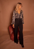 • Black and Taupe long sleeve blouse that features a spotted-pattern all over, a v-neckline and has a lush satin-effect in the fabric. This blouse also offers buttons up the front, elastic a the wrists and does not offer lining but no fear of any sheerness.