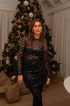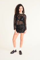 - The Black Clyde Blouse blends edgy and elegant in perfect harmony. Made from black fishnet-effect fabric adorned with shiny floral details, it exudes modern sophistication. With a slightly cropped fit and a classic crewneck, this blouse also features long sleeves with a subtle slit at the bottom for added flair. Unlined for a light, breathable feel, it’s the perfect piece to elevate both casual and dressy outfits.