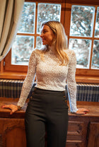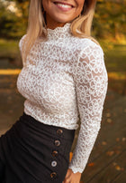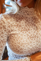 Beautiful, ecru long sleeve blouse made with a soft, dainty lace fabric that has a slight mockneck neckline as well as not having lining (white or skin-tone undergarment/bra recommended). This blouse is chic, versatile and perfect for all year round to style up or down.