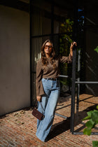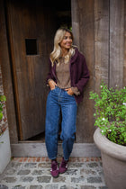 - Our models are also wearing the Blue Guetta Jeans, the Plum Jayde Cardigan, and the Blue Diego Jeans