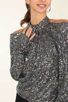 - Experience the ultimate in glamour and elegance with our Silver Tyler Blouse. The draped open back, slight mockneck, and long sleeves are highlighted by the stunning silvery glitter, making a bold statement and exuding confidence and luxury.