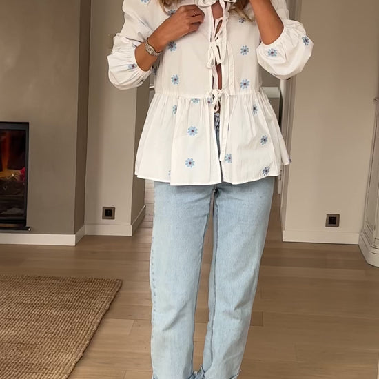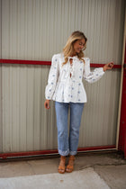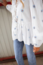 - Delicate and elegant, the White Floral Haby Blouse features long sleeves adorned with embroidered flowers. With a crewneck and a tie link at the bust for added detail, this blouse brings a touch of charm to any outfit