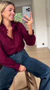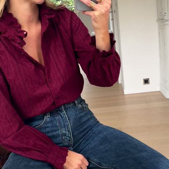 Turn everyday dressing into an art with the Burgundy Dorota Blouse. Intricate embroidery flows across the fabric, while the ruffled collar and buttoned cuffs add a touch of playful elegance. Lightweight and unlined, it’s a standout piece that elevates any outfit effortlessly.