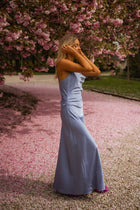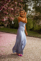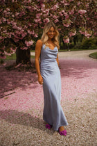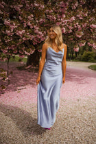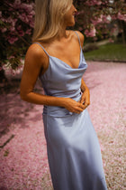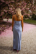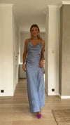 Elegant with a modern twist, the Blue Laura Dress brings understated allure to your wardrobe. This long dress features a draped neckline, adjustable straps, and a slightly fitted silhouette that flatters effortlessly. The satine finish adds a soft sheen, perfect for both day and evening occasions.