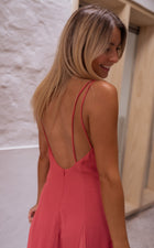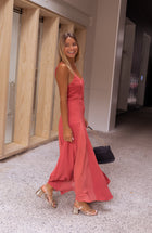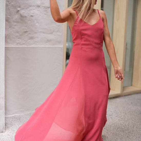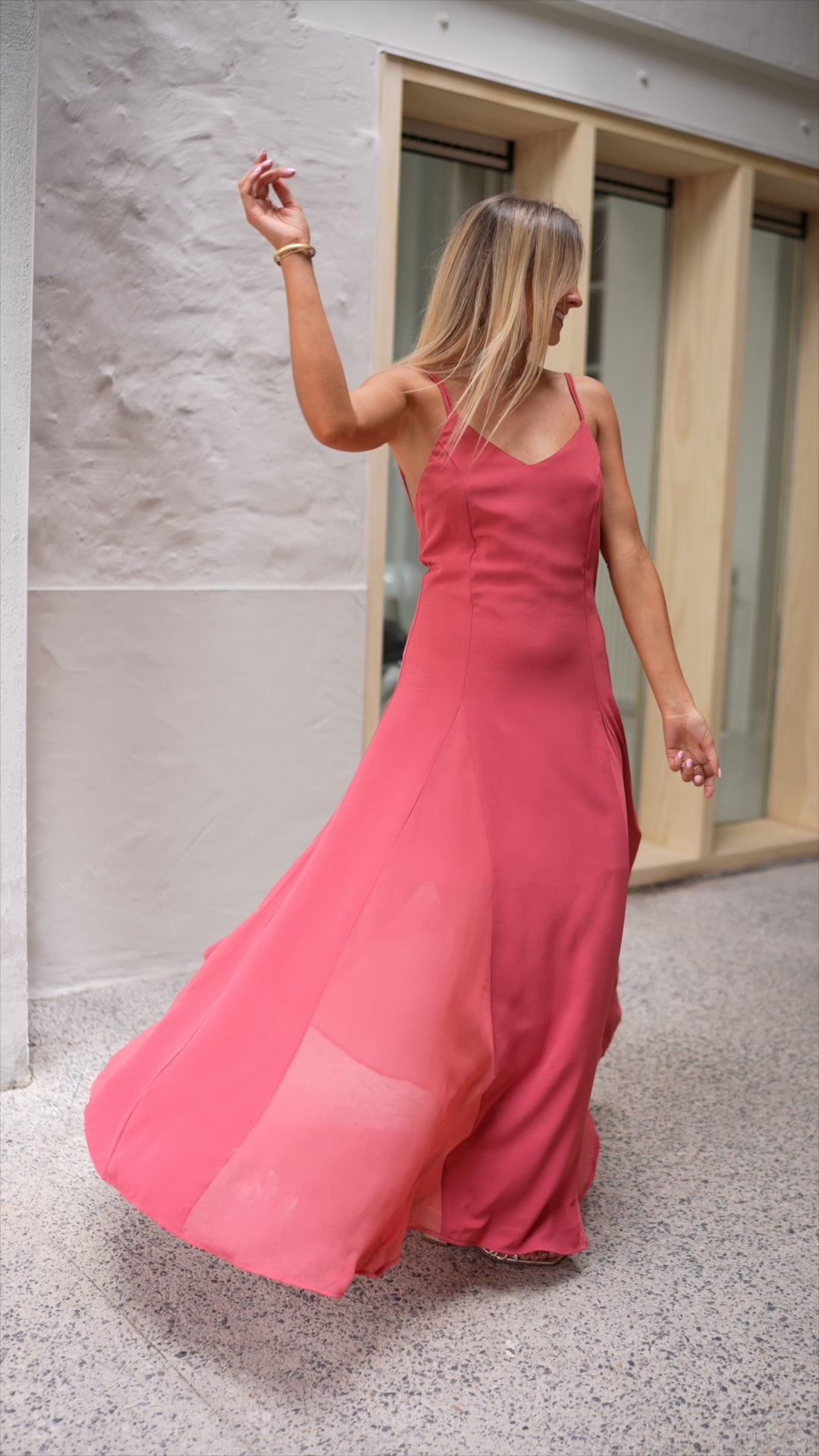 - A beautiful old pink colored long maxi, flared bottom dress with lush thin double-straps that are non-adjustable in addition to a deep neckline in the back and a sheer 'veil' detail on the sides as seen in the photos. This dress is super flowy and loose fitting which is perfect for those hot summer days or nights and also has a zipper in the back and lining from the top to the knees so no fear of any sheerness.