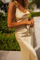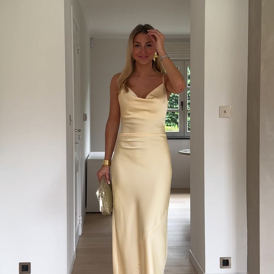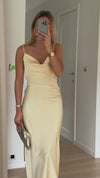 Elegant and softly striking, the Pale Yellow Laura Dress is designed to make a subtle statement. Crafted in smooth satin, it features a graceful draped collar effect and a slightly form-fitting silhouette that flatters without clinging. Adjustable straps and a discreet side zip offer a tailored fit, making it an ideal choice for both daytime events and evening occasions.