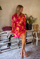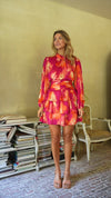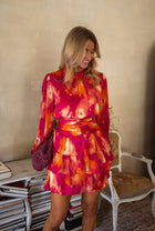 - Beautiful pink and orange patterned mini dress that features long sleeves, a flowy-comfortable fit and lining so no fear of any sheerness. This dress also features a slightly high collar, ruffle detailing at the bottom, as well as a cinched waist with elastic on the back for stretch and comfort.