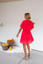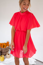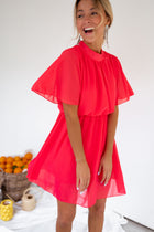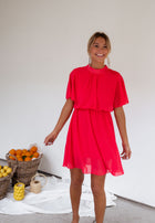 Beautiful raspberry mini dress featuring flared sleeves and a flattering elastic waist that accentuates your silhouette with a touch of feminine charm. With a slightly mockneck design and fluid fabric, this dress effortlessly combines style and comfort. It is also lined for a polished and seamless look, making it the perfect choice for both casual and dressy occasions!