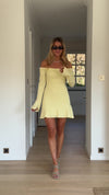 - Step into bold style with the Yellow Athena Dress. This mini dress features an off-the-shoulder square neckline and long sleeves. Crafted from smocked crepe chiffon, fully lined, back zipper closure.