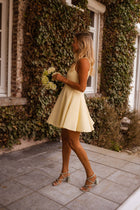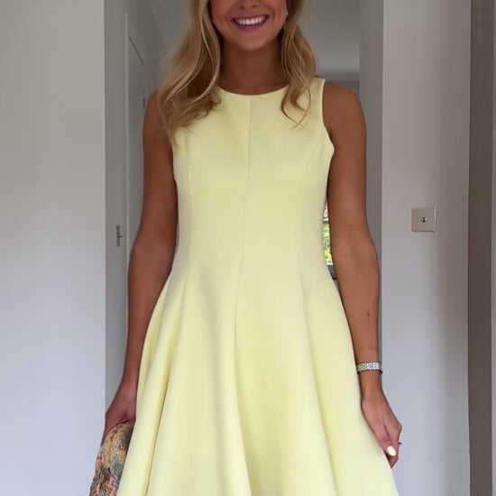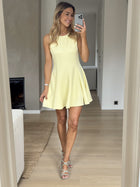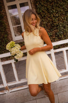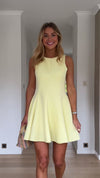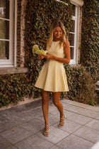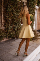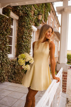 Brighten up your day with the Yellow Melissa Dress. This playful mini dress features a flattering skater silhouette with a pleated skirt that moves beautifully with every step. Designed with a classic crewneck, hidden back zipper, and full lining for comfort and ease.